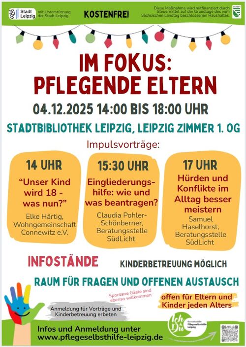 Wir möchten einen Nachmittag pflegende Eltern in den Mittelpunkt stellen und einladen zu Vorträgen, Infoständen und offenem Austausch. Sie leisten rund um die Uhr wahnsinnig viel und sind wenig sichtbar im öffentlichen Leben. Deshalb lädt die Kontaktstelle Pflegeselbsthilfe in Kooperation mit der Pflegekoordination der Stadt Leipzig Eltern ein, die ein Kind mit Beeinträchtigung haben - egal welcher Art und welchen Alters -, zu einem bunten Nachmittag in der Stadtbibliothek Leipzig im 1. OG (Zugang barrierefrei).
